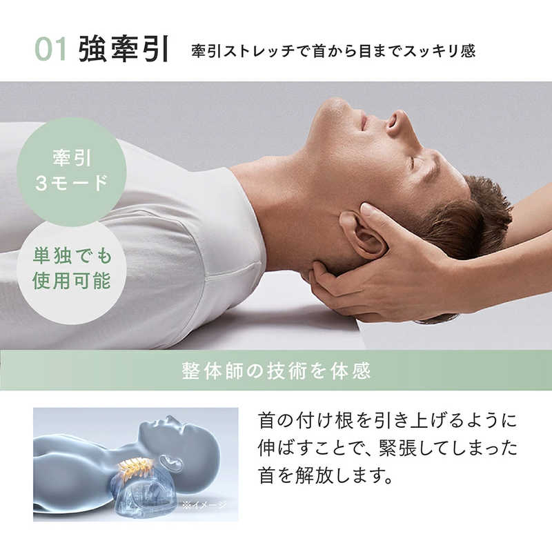 エアバッグで肩をしっかり固定し、首の付け根を無理なく引っ張ることで、まるで人の手で引き上げられるような心地よさを実現。