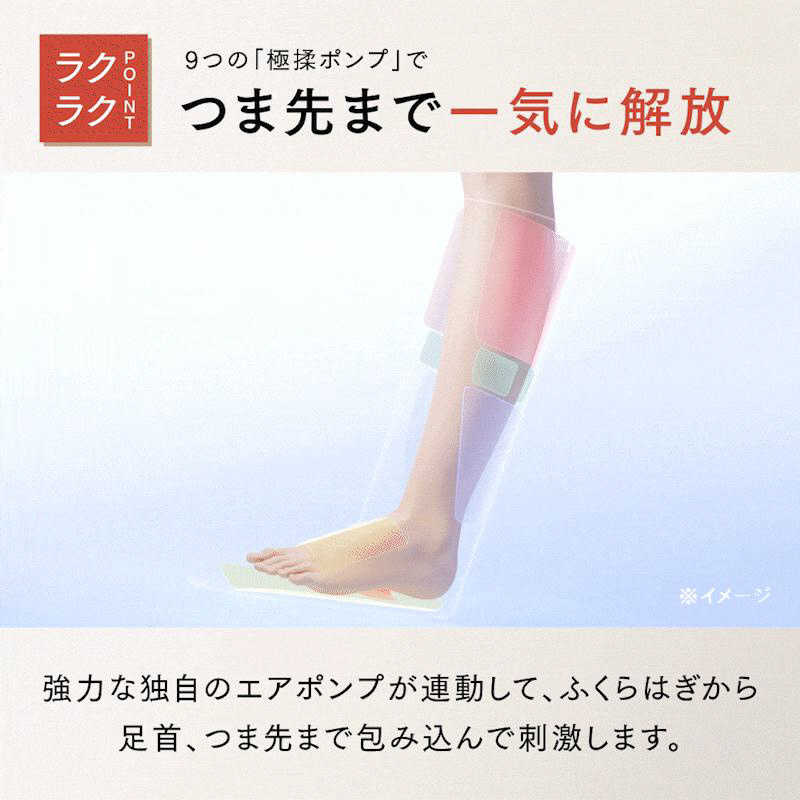 強力な独自のエアポンプが連動して、ふくらはぎから足首、つま先まで包み込んで刺激します。