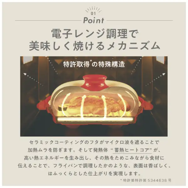 セラミックコーティングのふたがマイクロ波を遮ることで加熱ムラを防ぎます。
