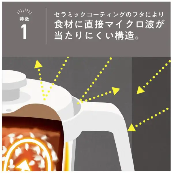 セラミックコーティングのふたがマイクロ波を遮ることで加熱ムラを防ぎます。