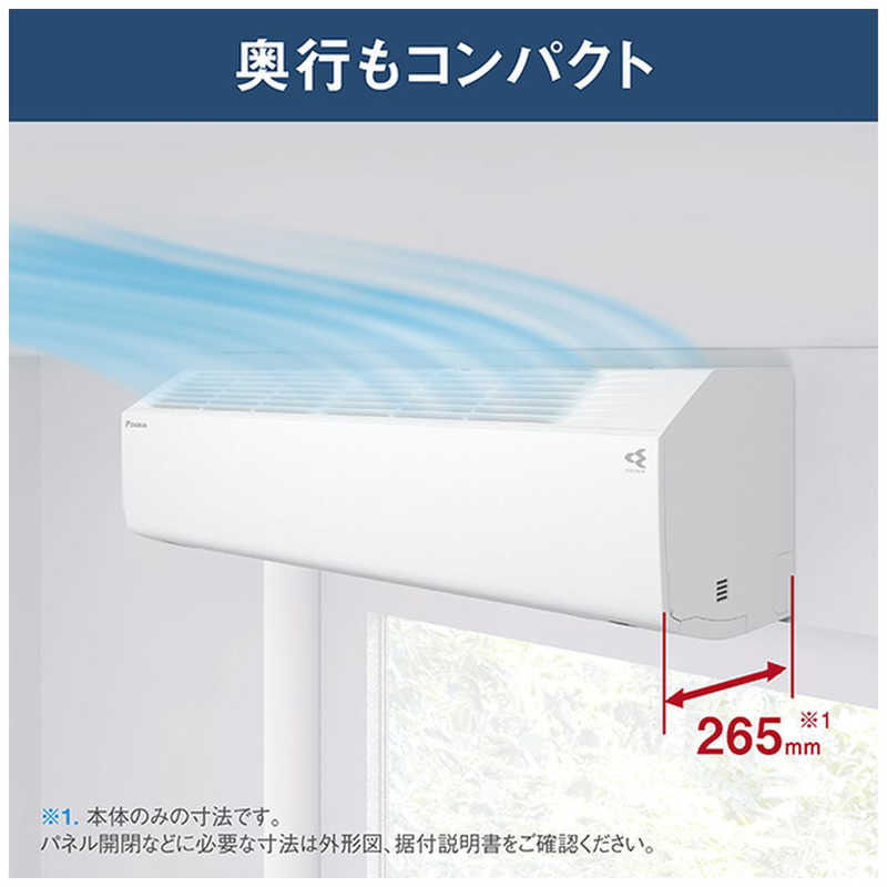 高さ250mm×奥行265mmのサイズでありながら、本体上部をカットしたナナメカット形状で吸い込みの効率化をはかりました。グッドデザイン賞受賞のスタイリッシュでコンパクトデザインなので、据付けの自由度が高く、窓上の限られたスペースなどにも設置しやすい仕様です。