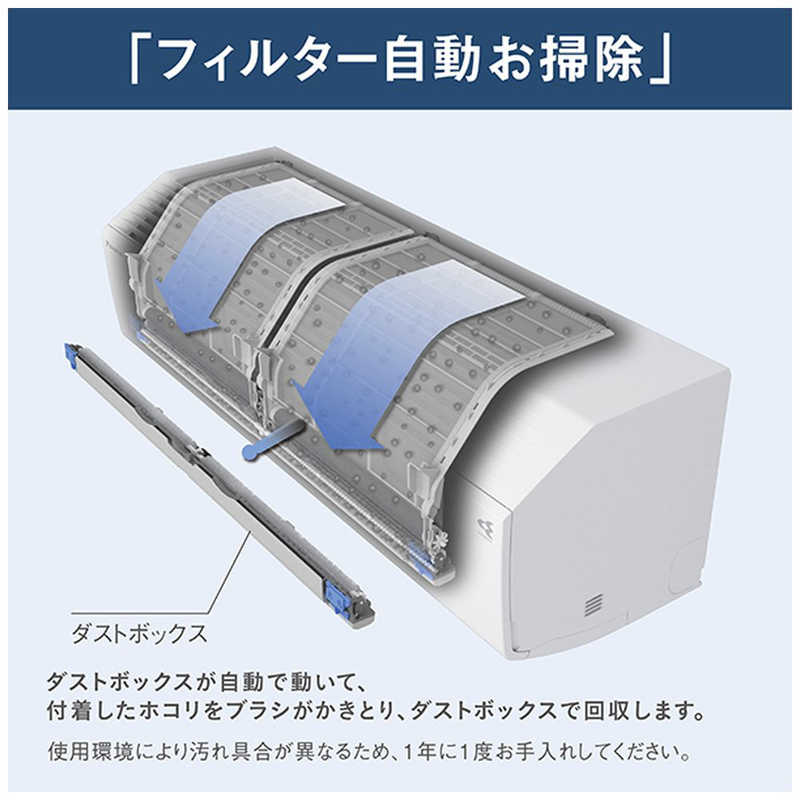 エアコンの運転終了後、自動的にフィルターのホコリをブラッシングして、ダストボックスに回収。フィルターの目詰まりを抑えます。