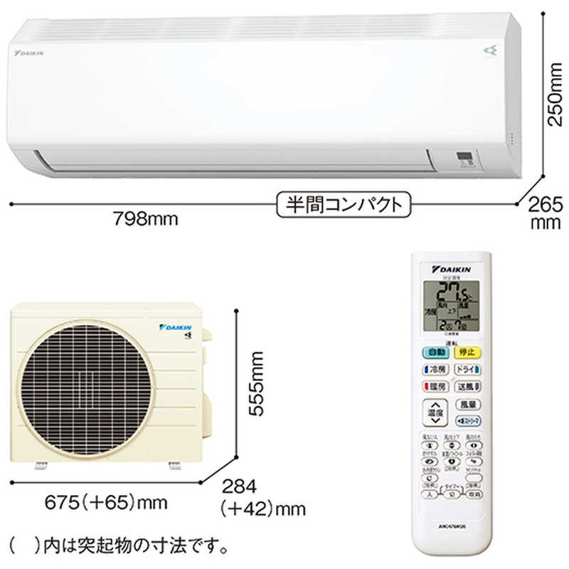 ●室外機サイズ(幅×高さ×奥行)mm: 675(+65)×555×284(+42)6mm