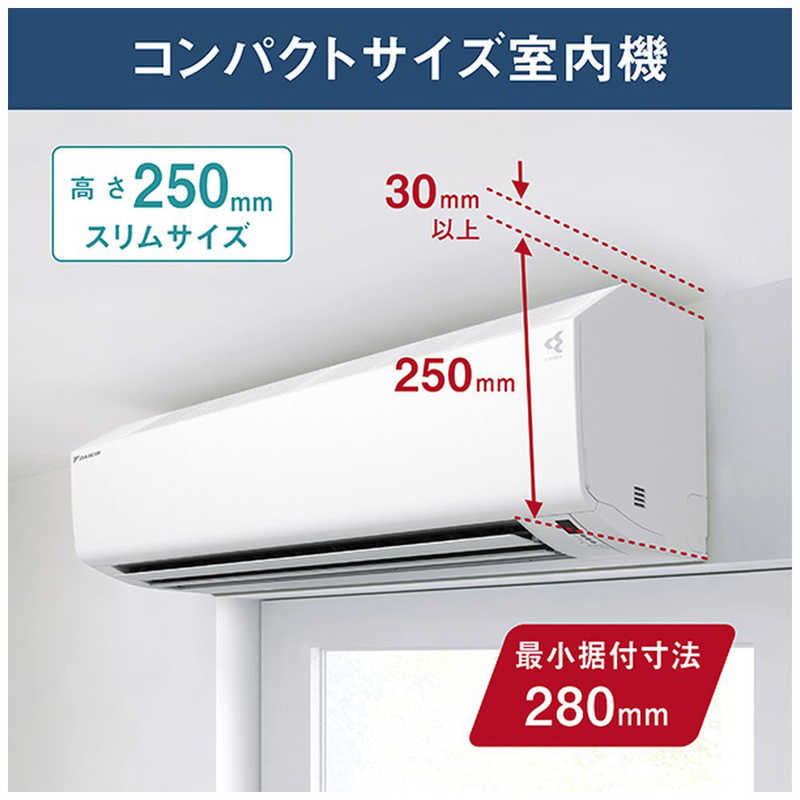 高さ250mm×奥行265mmのサイズでありながら、本体上部をカットしたナナメカット形状で吸い込みの効率化をはかりました。グッドデザイン賞受賞のスタイリッシュでコンパクトデザインなので、据付けの自由度が高く、窓上の限られたスペースなどにも設置しやすい仕様です。