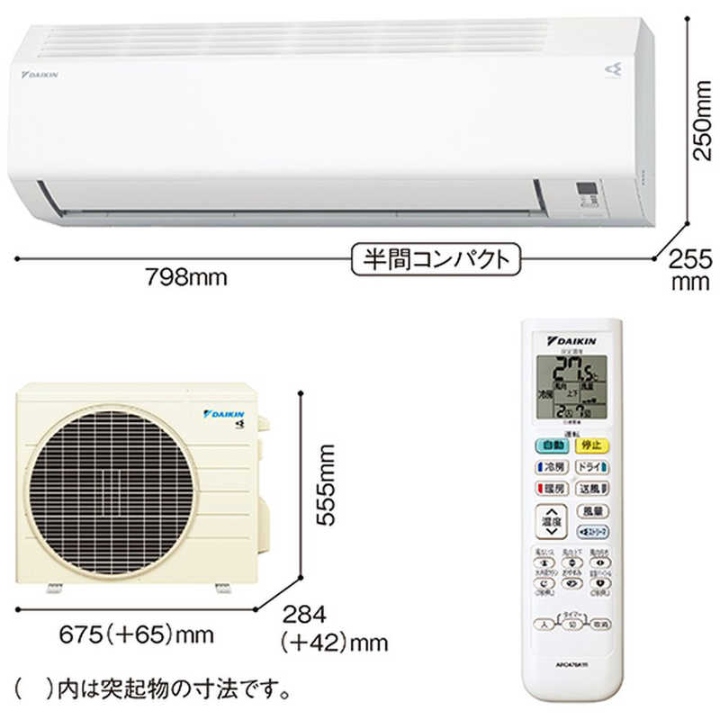 ●室外機サイズ(幅×高さ×奥行)mm: 675(+65)×555×284(+42)6mm