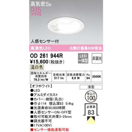 オーデリック ODELIC 人感センサー付LEDベースダウンライト 埋込穴φ100 白熱灯60Wクラス 温白色 非調光 人感センサーON-OFF型 OD261944R