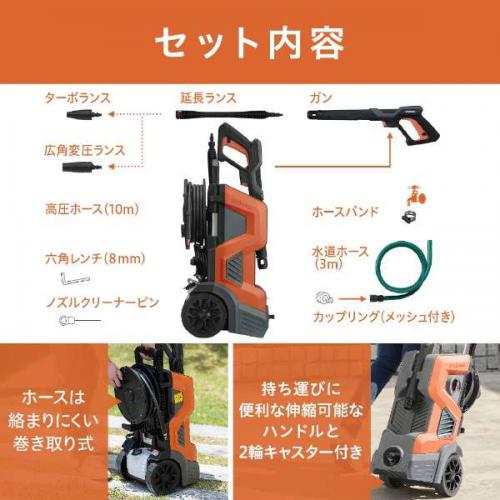 ●付属品:ターボランス、広角変圧ランス、延長ランス、ガン、高圧ホース(10m)、六角レンチ(8mm)、ノズルクリーナーピン、ホースバンド、水道ホース(3m)、カップリング(メッシュ付き)