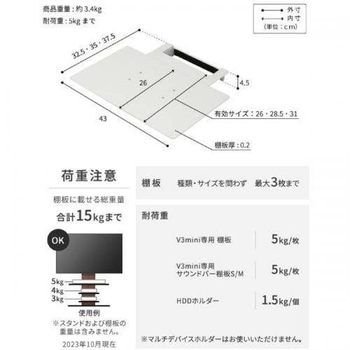 棚板やサウンドバー棚は合わせて3枚まで組み合わせて取り付けができます(合計耐荷重15kgまで)。