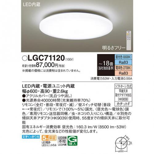 パナソニック Panasonic LEDシーリングライト ~18畳 調色 調光 LGC71120