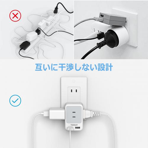 TESSAN テッサン 電源タップ USB コンセントタップ 雷ガード付 3個AC口 2つUSBポート 分岐 充電 スイングプラグ TS-723-GR-JP