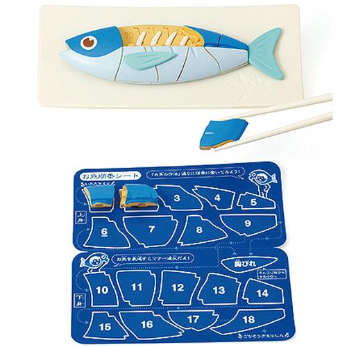 ●セット内容/お箸1膳、お皿1枚、お魚順番シート1枚、説明書(作法書)1冊、魚ピース18個、胸びれ1枚、頭&骨1個