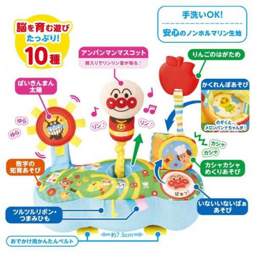 鈴の入ったアンパンマンのマスコットやりんごのはがため、つまみひもなど、脳を育む遊びがたっぷり10種類!