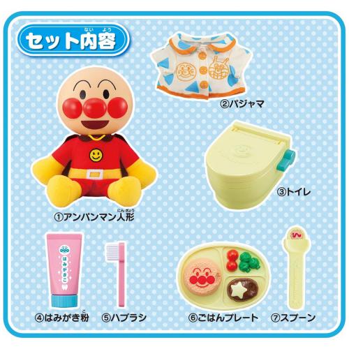 アンパンマン人形にパジャマを着せておきがえと寝かしつけの遊びが楽しめます。