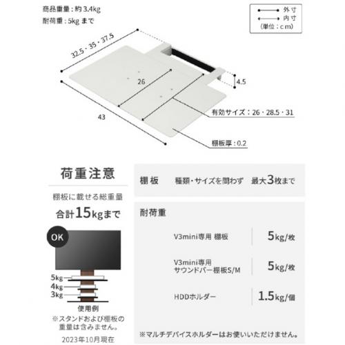 棚板やサウンドバー棚は合わせて3枚まで組み合わせて取り付けができます(合計耐荷重15kgまで)。