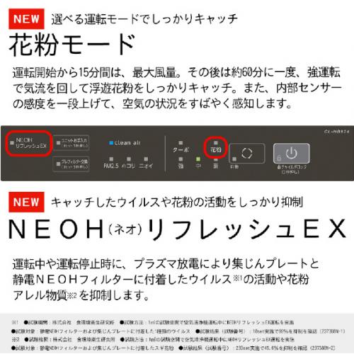 ●NEOHリフレッシュEX。運転中や停止時にプラズマ放電により発生した低濃度オゾンで、集塵プレートと静電NEOHフィルターに付着したウイルスを抑制。抑制スピードは従来機比の約3倍にアップ。製品内の清潔をより速くキープします。