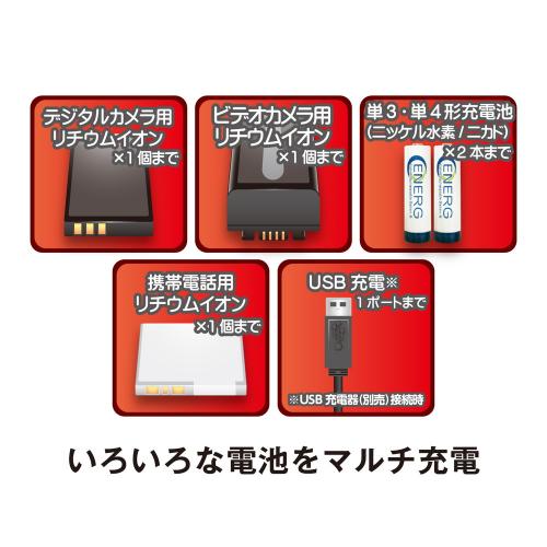 リチウムイオンバッテリーパック、ニッケル水素充電池(単3形・単4形)、ニカド充電池(単3形・単4形)に対応。USB充電器をコンセントにつなげれば、本機1つでさまざまなデジタルカメラのバッテリーパックを充電することができます。