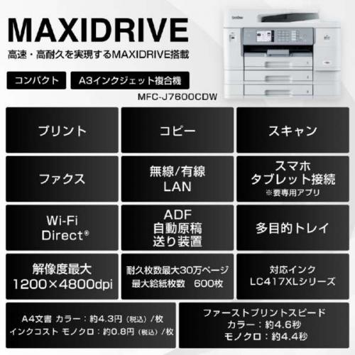 ブラザー brother A3対応インクジェット複合機 ファーストタンク ホワイト MFC-J7600CDW