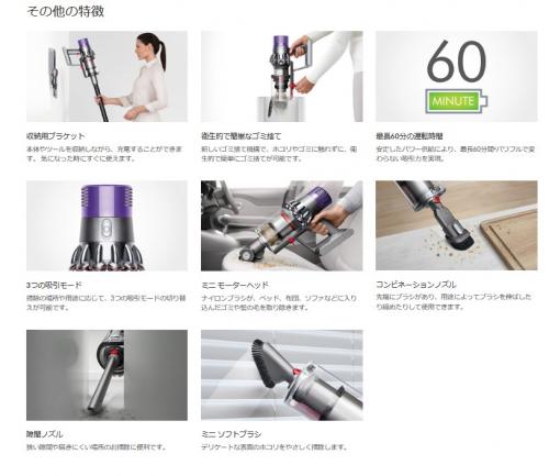 付属品 : Fluffyクリーナーヘッド、ミニモーターヘッド、コンビネーションノズル、隙間ノズル、ミニソフトブラシ、収納用ブラケット