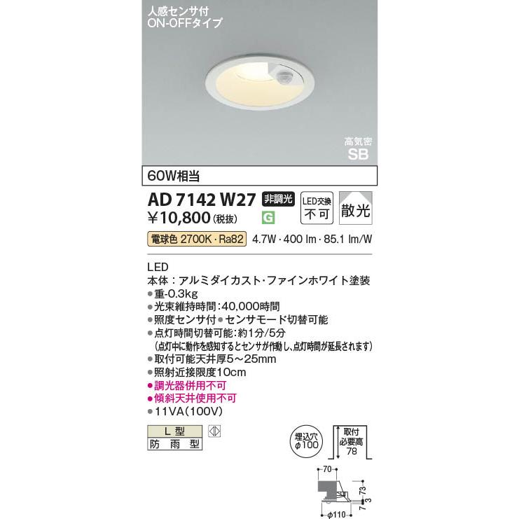 【SALE】コイズミ KOIZUMI LEDダウンライト 電球色 AD7142W27