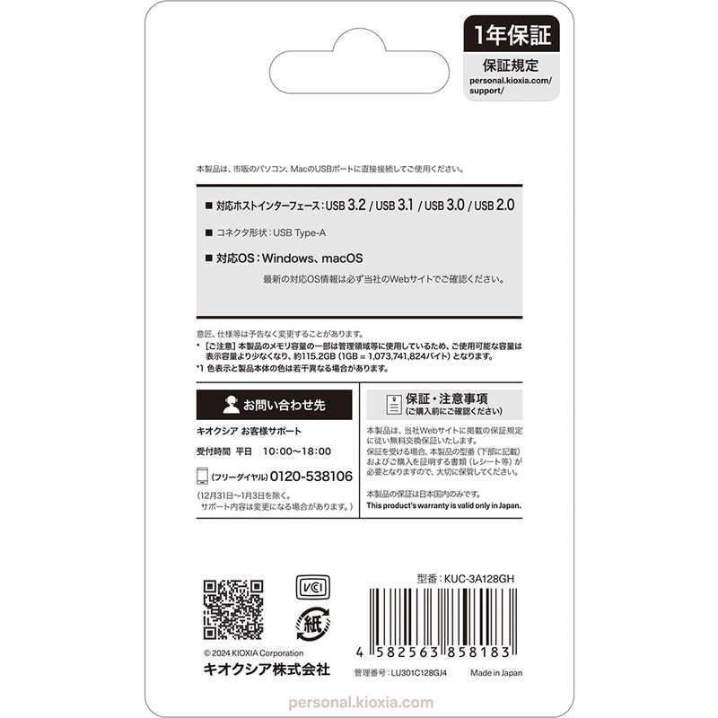 キオクシア KIOXIA USBフラュシュメモリー 128GB グレー KUC-3A128GH