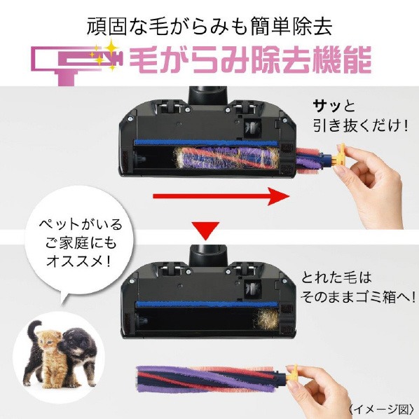 植毛の改良により吸引力の低下につながる毛のからみを抑え、からんだ時もサッと引き抜くだけで簡単除去お手入れのわずらわしさを軽減します。回転ブラシは水洗いもでき、いつも清潔さを保てます。