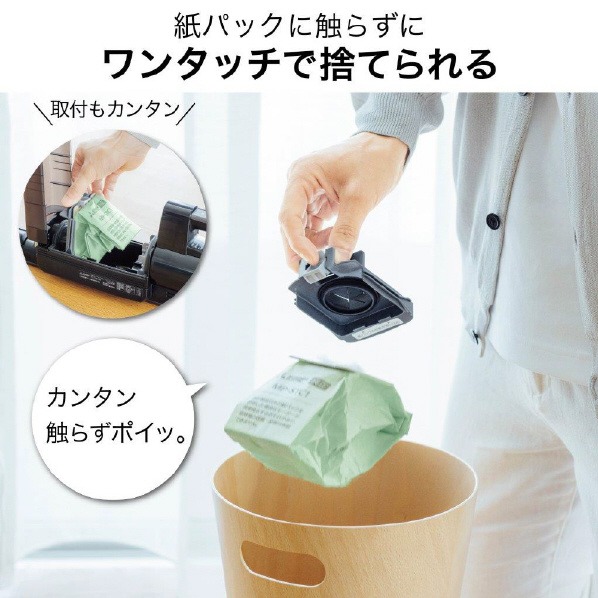 紙パックに触らずにワンタッチで捨てられる。紙パックの取り付け、取り外しもカンタンです。