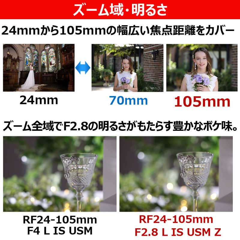 ●EOS R システムの特長である大口径マウントとショートバックフォーカスを活かし、開放F値2.8通しでありながら、広角24mmから中望遠105mmまでを1本でカバーした大口径標準ズームレンズ。