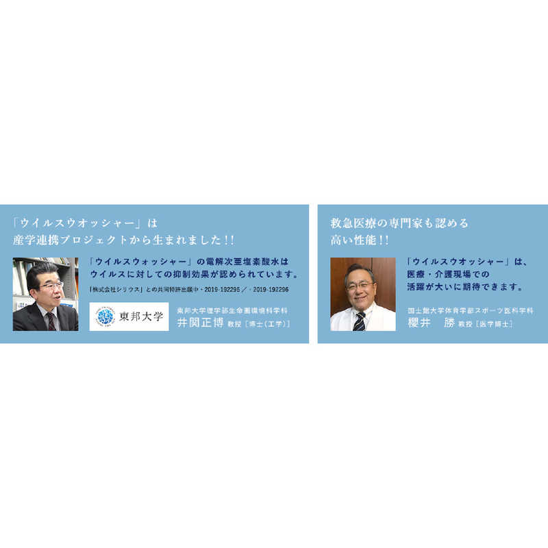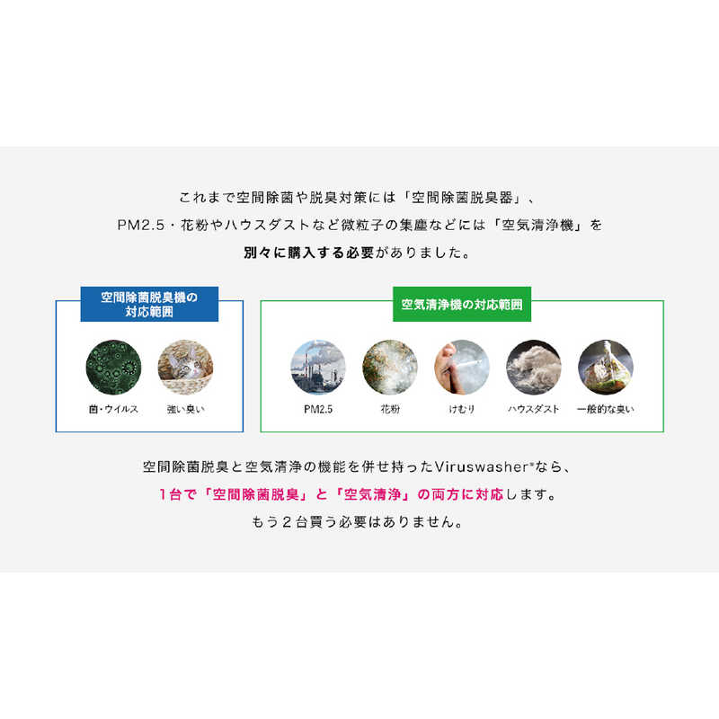 次亜塩素酸の力で空間の除菌・脱臭を行いながら、HEPAフィルターで微細な粒子を捕集し空気清浄も行う。
