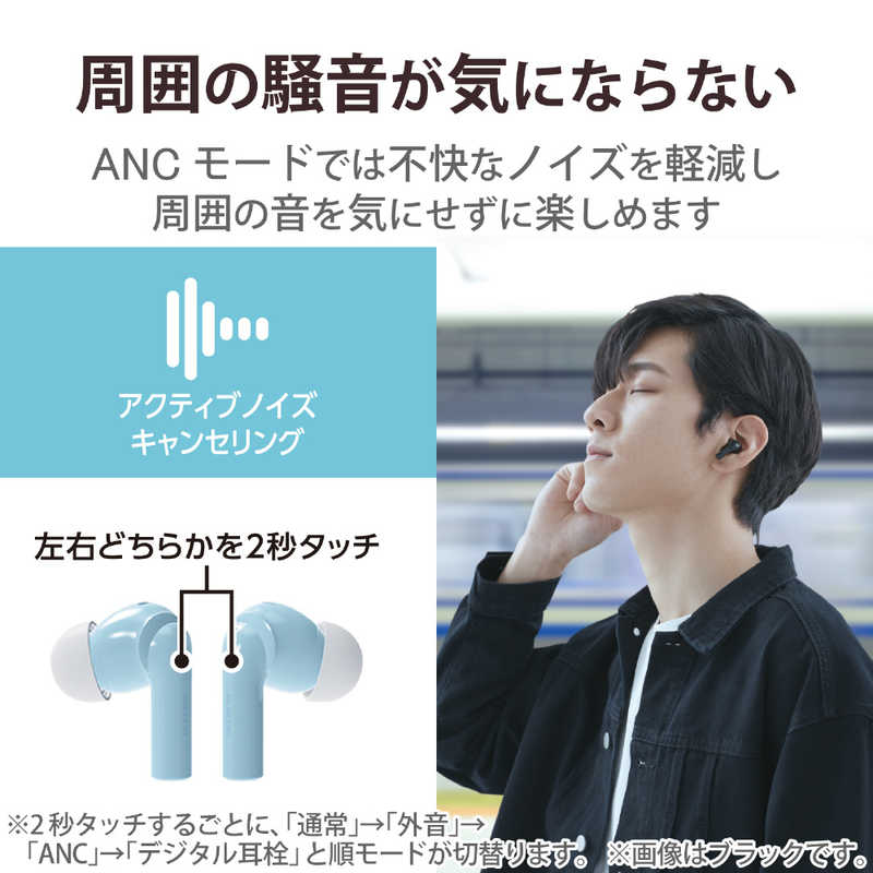 アクティブノイズキャンセリング(ANC)機能により、周囲の騒音を気にせず音楽を楽しめる。