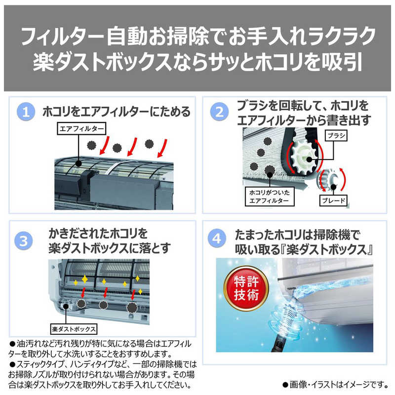 フィルター自動お掃除でお手入れラクラク。楽ダストボックスならサッと誇りを吸引。