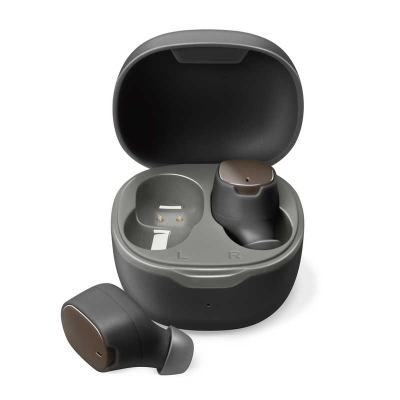 シックな2トーンカラーにメタリック加工を施したデザイン。高音質・低遅延のAACに対応し、快適な音質を楽しめる。防水等級IPX5をクリアし、汗や雨を気にせず使用が可能。