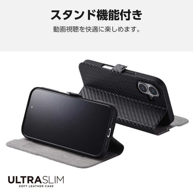 エレコム ELECOM iPhone 16(6.1インチ)ソフトレザーケース 薄型 磁石付 カーボンブラック PMA24APLFUCB
