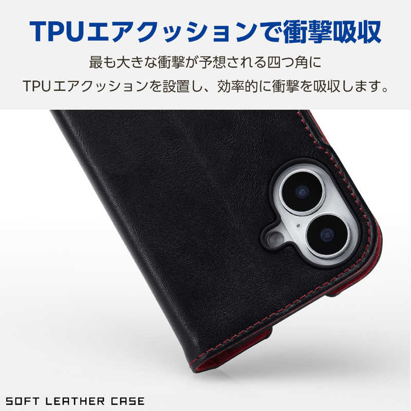 エレコム ELECOM iPhone 16(6.1インチ)ソフトレザーケース 磁石付 耐衝撃 ステッチ ブラック PMA24APLFYBK