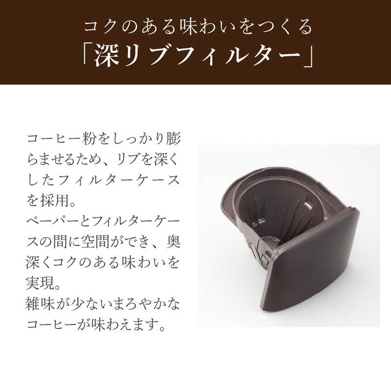 ●コクのある味わいをつくる「深リブフィルター」 コーヒー粉をしっかり膨らませるため、リブを深くしたフィルターケースを採用しました。
