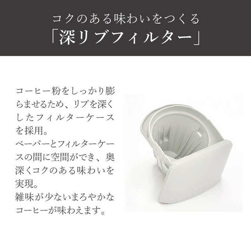 ●コクのある味わいをつくる「深リブフィルター」 コーヒー粉をしっかり膨らませるため、リブを深くしたフィルターケースを採用しました。