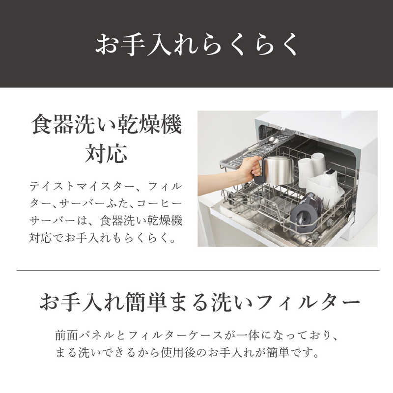 ●食器洗い乾燥機対応 テイストマイスター、フィルター、サーバーふた、コーヒーサーバーは、食器洗い乾燥機対応でお手入れもらくらく。
