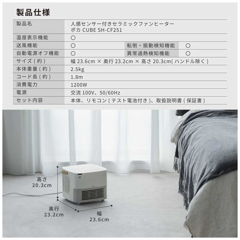 シロカ siroca 人感センサー付き セラミックファンヒーター ポカCUBE ホワイト SH-CF251-W