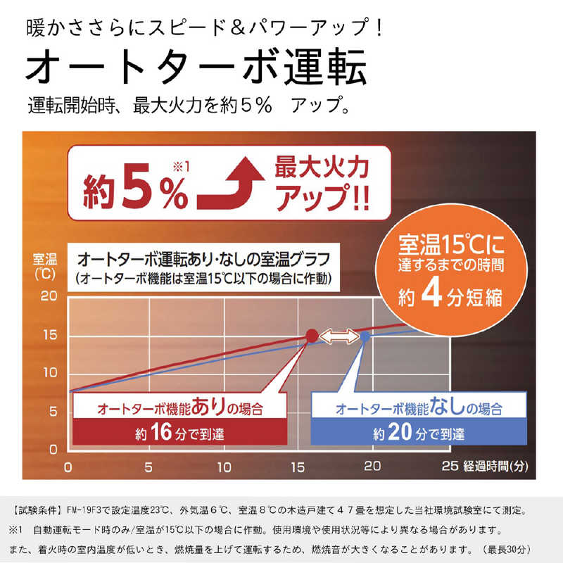 さらに室温が15℃以下の場合、燃焼開始後に自動で最大火力を5%アップするオートターボ運転で、冷え切ったお部屋をすばやく暖めます。