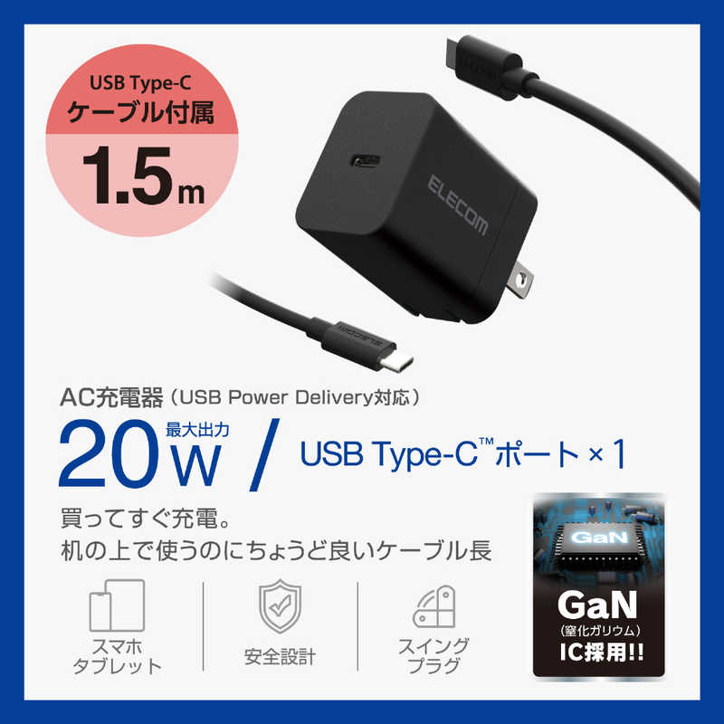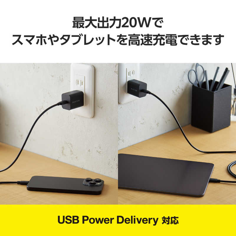 エレコム ELECOM USB Power Delivery 20W AC充電器(C-Cケーブル付属/1.5m) ブラック MPA-ACCP7120BK