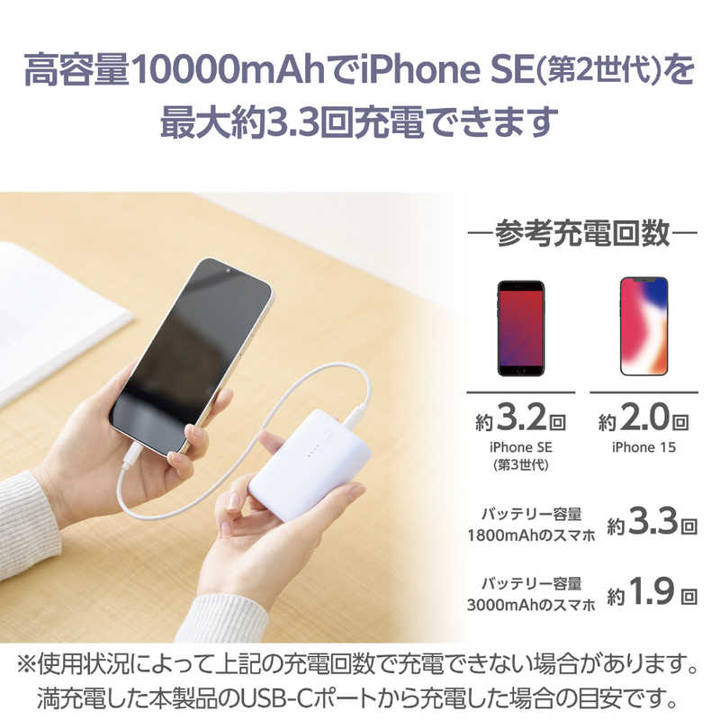 ■本製品(バッテリー容量10000mAh)で、1800mAhのスマートフォンを約3.3回、3000mAhのスマートフォンを約1.9回充電可能です。