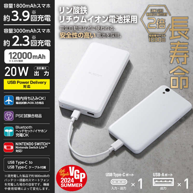 エレコム ELECOM リン酸鉄モバイルバッテリー(12000mAh/PD20W/C×1+A×1) DE-C39-12000WH