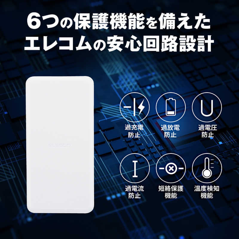 ■過充電・過放電・過電圧・過電流防止機能および短絡保護機能と温度検知機能の6つの保護機能を備えた安心の回路設計です。