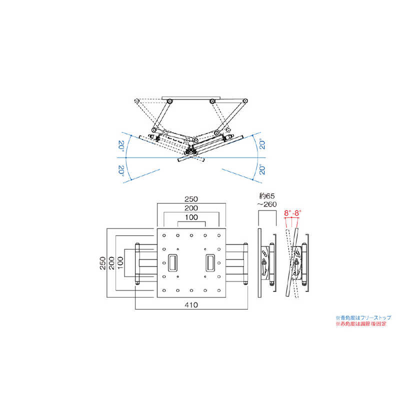 ◆角度調節(左右) 角度調節可能(左右各20度任意調節)。奥行約65~260mm。約195mm前方へ引き出す事が可能。