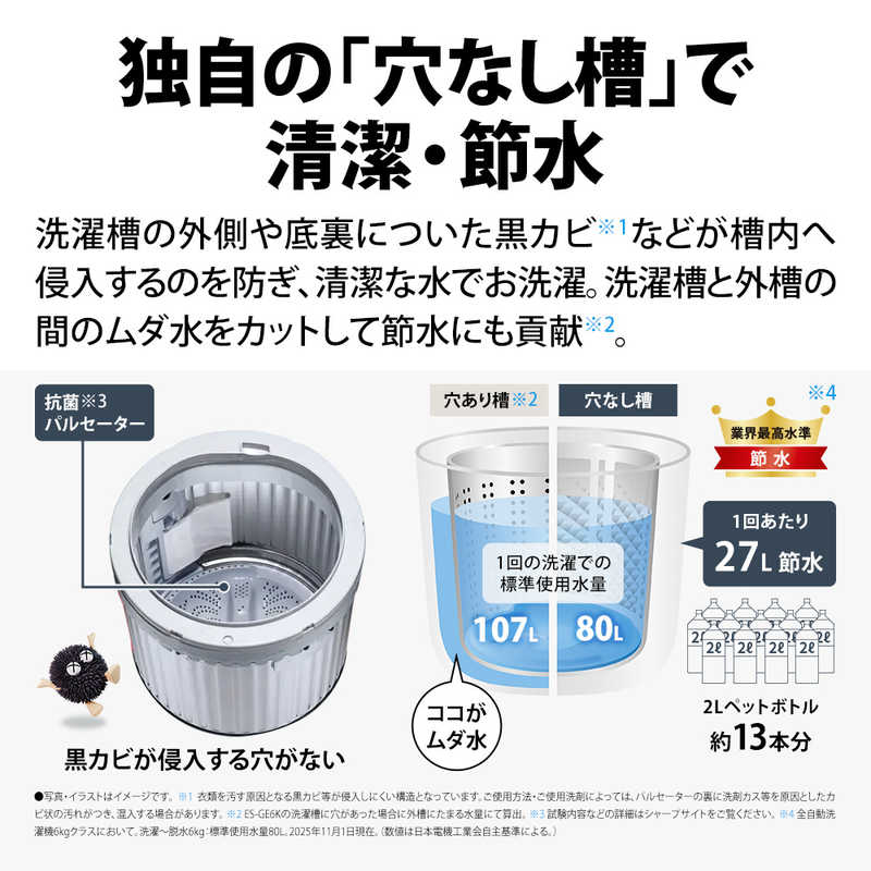 ●洗濯槽と外槽の間のムダ水をカット「穴なし槽で節水!」