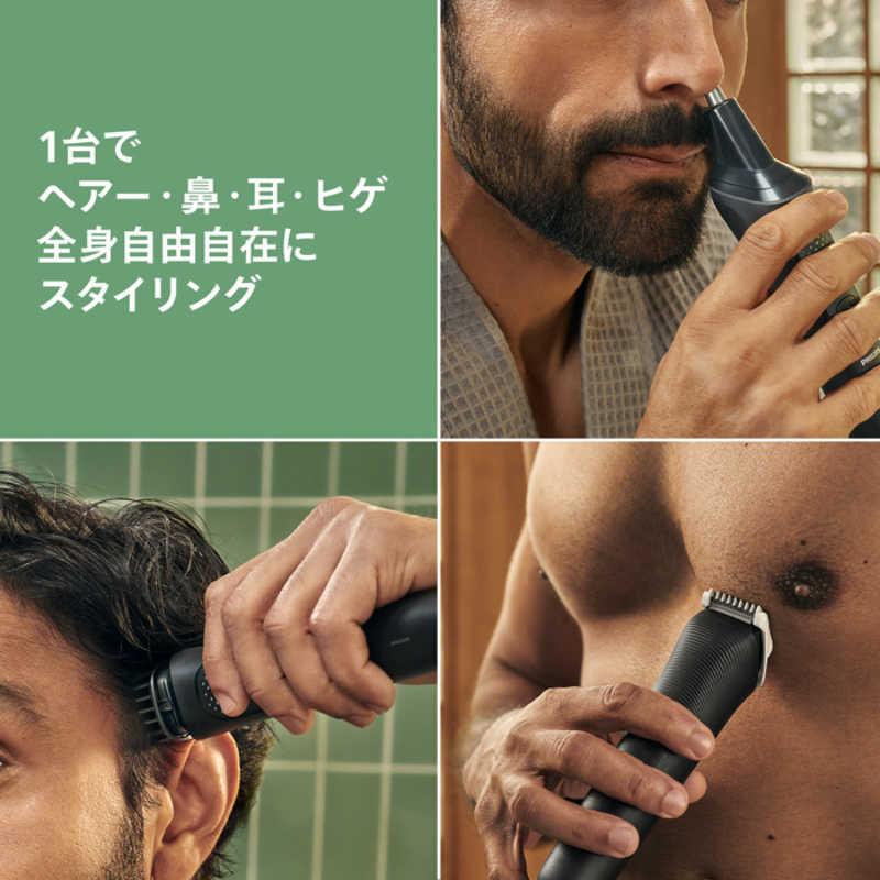 ●同梱物 本体 +トリマー、 取扱説明書、 充電ケーブル、 鼻毛・耳毛トリマー (回転式)、 フルメタル細部トリマー、 調節式コーム (1 mm ~ 3 mm)、 ヒゲトリミング用コーム (5 mm)、 ヘアートリミング用コーム (9 mm)、 ヘアートリミング用コーム (12 mm)、 ヘアートリミン用グコーム (16 mm)、 ボディートリミング用コーム (3 mm)、 VIO コーム (1 mm)、 クリーニングブラシ、 ポーチ、※USB 充電アダプタは同梱されておりません