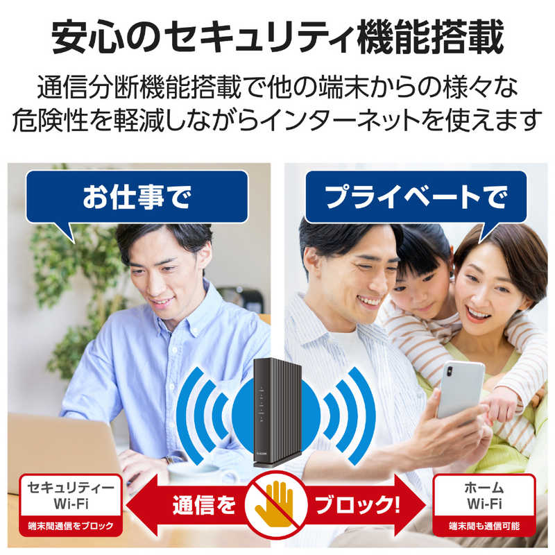 ●セキュリティWi-Fi(通信分断機能)搭載で他の端末からウイルス感染されたり、情報を盗み見られたりする危険性を軽減しながらインターネットができます。