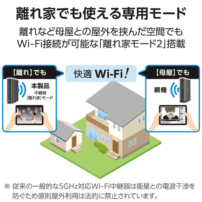 ●便利な「離れ家モード2」搭載。屋外を含む敷地内の母屋と離れた建物で中継器として使用可能なほか、「離れ家モード2」対応製品では全ての基本動作モードに対応。親機として使用している場合も、玄関先やベランダなど敷地内の屋外に設置されたデバイスと5GHz(W56のみ)でWi-Fiで接続することが可能です。