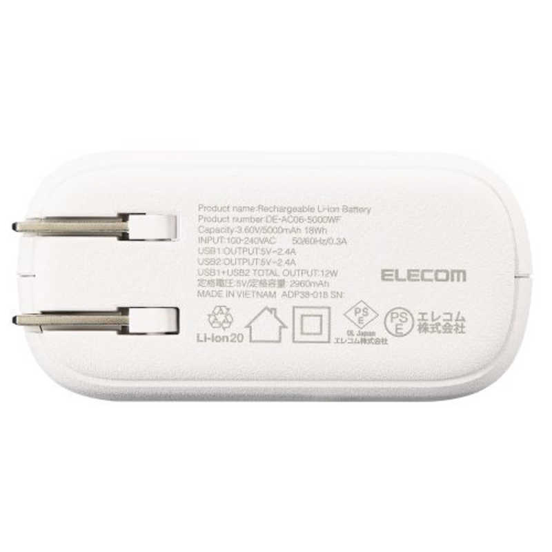 エレコム ELECOM モバイルバッテリー コンセント一体型 5000mAh 12W 出力( USB A ×2) 2台同時充電可 PSE認証 DE-AC06-5000WF