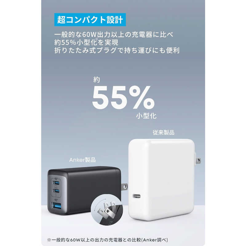 一般的な60W出力以上の充電器と比較して約55%小さいコンパクトサイズ。折りたたみ式プラグを採用しているため、どこへでも気軽に持ち運ぶことができます。