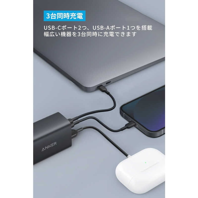 スマートフォン、タブレット、MacBook、USB PD対応のWindowsノートPCなど、多種多様なデバイスを一度に充電可能。PowerIQ 3.0 (Gen 2) を 搭載した2つのUSB-CポートとAnker独自技術PowerIQ搭載のUSB-Aポートを備えています。3ポート利用時の合計最大出力は64Wと高出力。機器毎に異なる充電器を持ち運ぶ必要はありません。